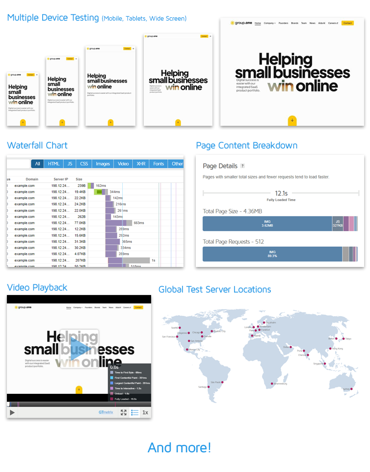 - The other tools (including GTmetrix) provide detailed Waterfall charts, Filmstrips, and Video playback for a clearer picture of how your page loads and where bottlenecks occur.