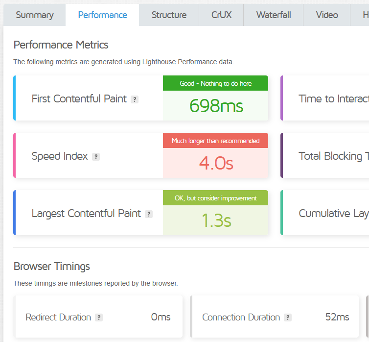 Below the Performance Score metrics, you’ll see various Browser Timings, which represent different milestones reported by the browser.