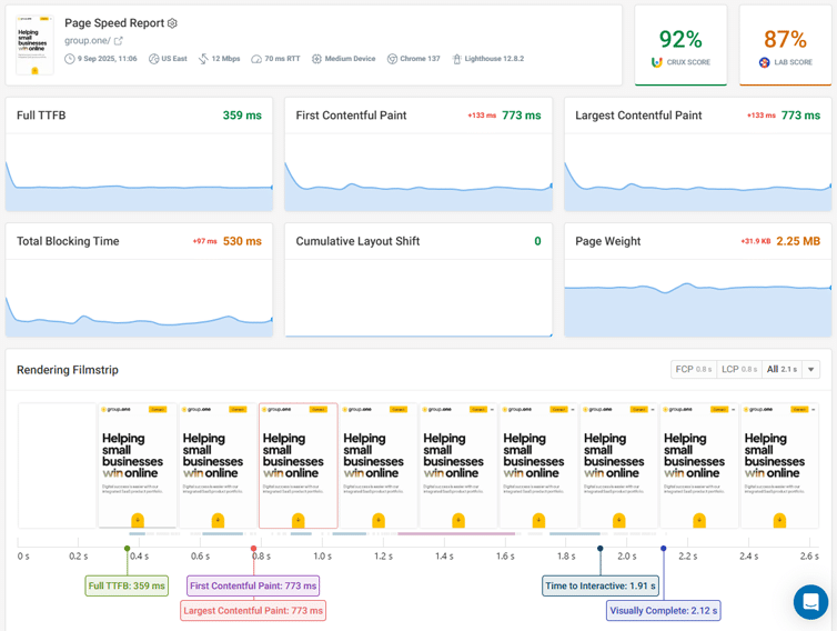 - The report provides both Lab and CrUX Scores, and you also get Real User Monitoring (RUM) giving you a lot of data, and points of comparison.