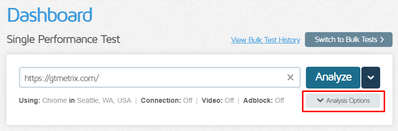 To simulate a device, enter a URL into the Analyze field first, then expand your Analysis Options.