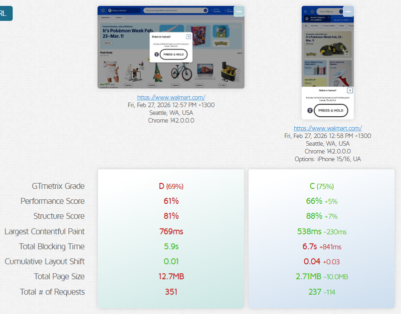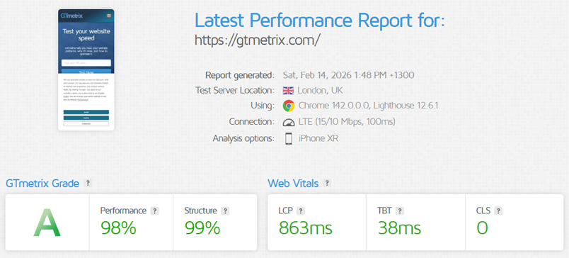 GTmetrix provides a reliable benchmark for layout and asset delivery, but it is not a 1:1 representation of real-world performance because GTmetrix does not simulate actual mobile hardware performance like CPU or memory. It only mimics browser-level characteristics, so results may differ from real-device testing.