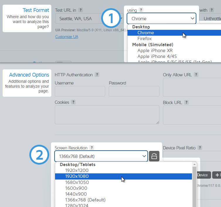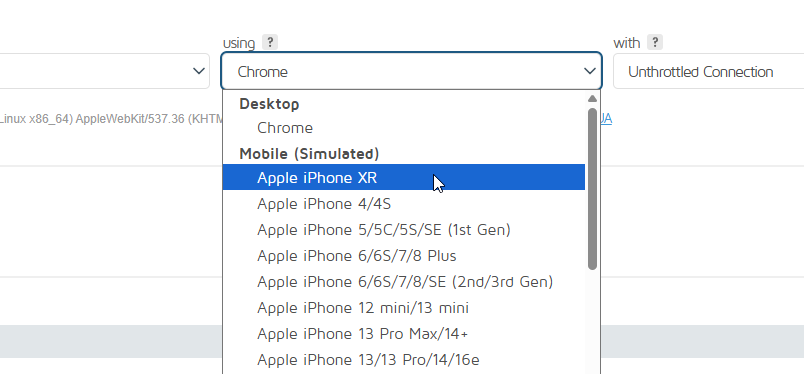 - Screen Resolution – An iPhone XR for example is 414×896 (GTmetrix default is Desktop – 1366×768)