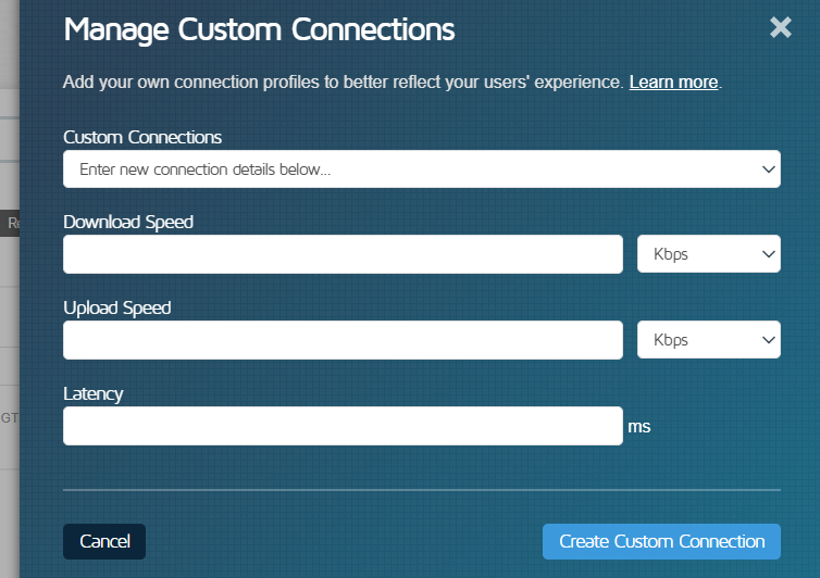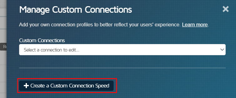 Clicking on it will open a side menu – Here you can input the down/up speed values in Kbps or Mbps, and the latency in milliseconds (ms). Click Create Custom Connection when you’re done.