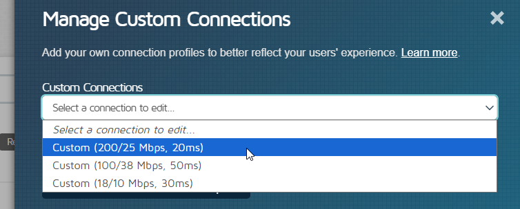 Note: If a preset is using a Custom Connection, and the Custom Connection is edited or deleted, the preset will still use the original download/upload/latency values for the connection speed as when it was first saved. You’ll need to edit the preset to match the changed values.