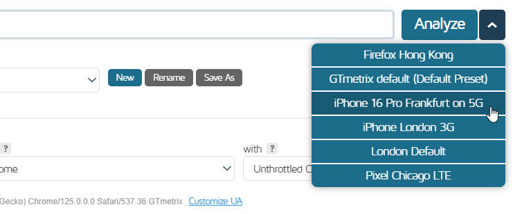 Have a preset that combines a mobile connection and your desired mobile hardware like an iPhone or Android device so you can easily analyze and monitor your site on mobile.