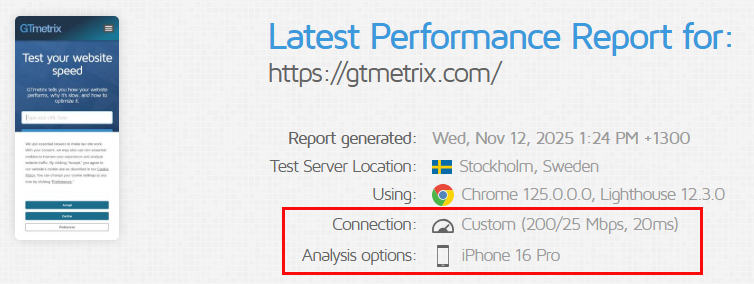 Useful if you want to test how a unique connection speed (high speed broadband, corporate fibre connection, 5G connection, etc.) may affect your site’s load performance.