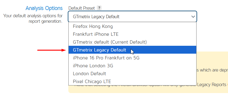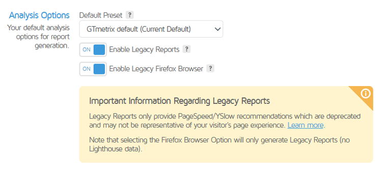 If you wish to only use Legacy Reports for your GTmetrix tests, you can set your default Analysis Options to reflect that depending on whether you are on a Basic (Free) or PRO plan.
