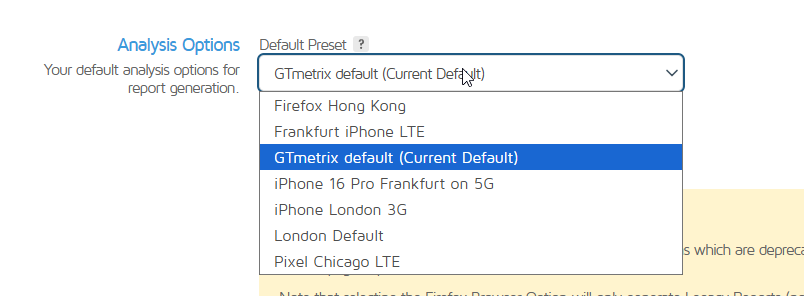 Going forward, GTmetrix will use your selected Analysis Preset as your new default Analysis Options.